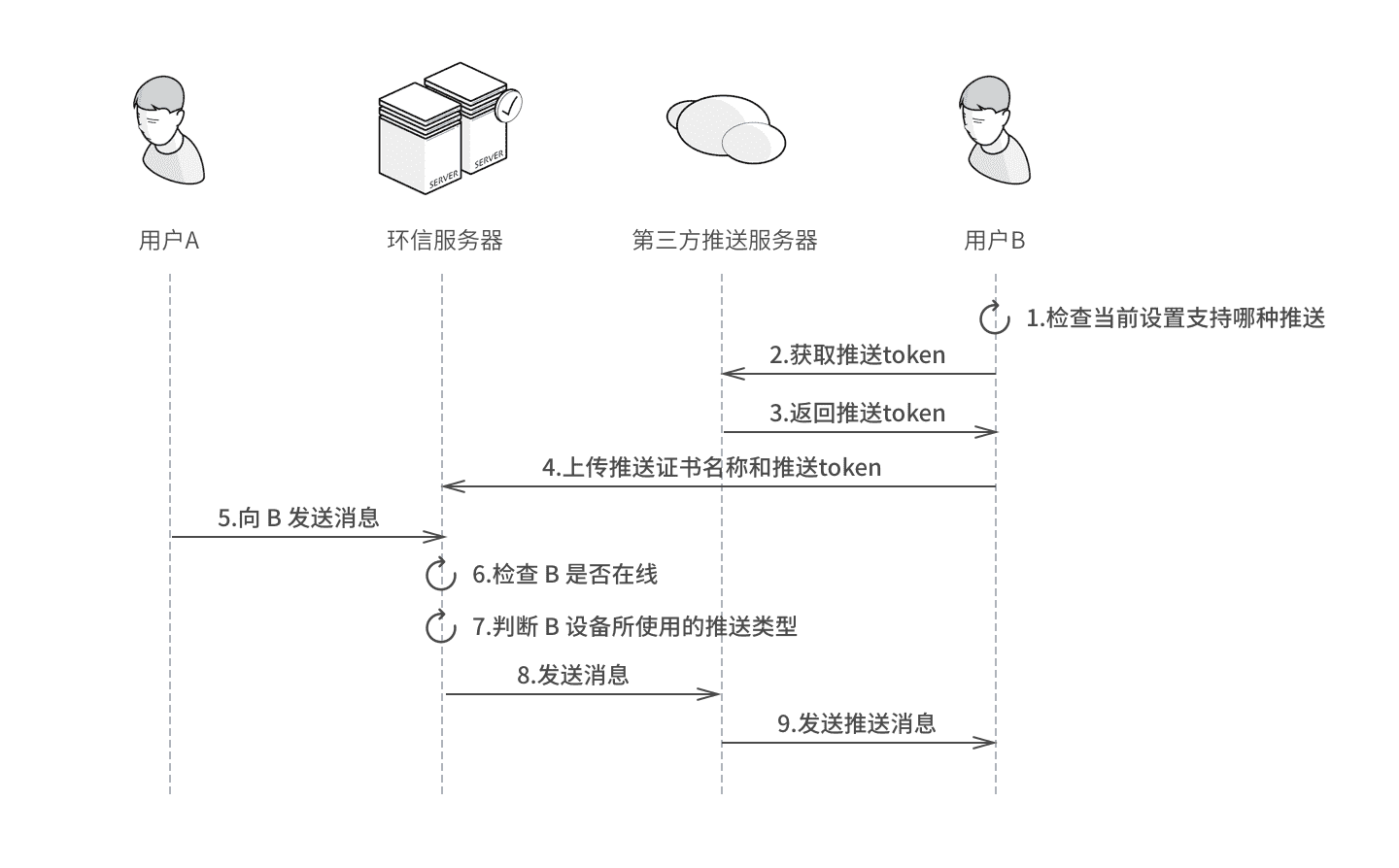 - 向某设备发送消息时,环信服务器会先判断目标设备是否在线,如果目标设备不在线,则判断目标设备使用了哪种推送通道(根据目标设备上传的证书名称),使用该推送通道通过第三方推送服务器将消息推送至目标设备。