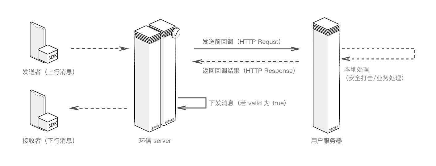 - 发送前回调:回调的主要目的在于让 app 后台可以干预该事件的处理逻辑,环信 IM 服务器会根据回调返回码和返回值确定后续处理流程;