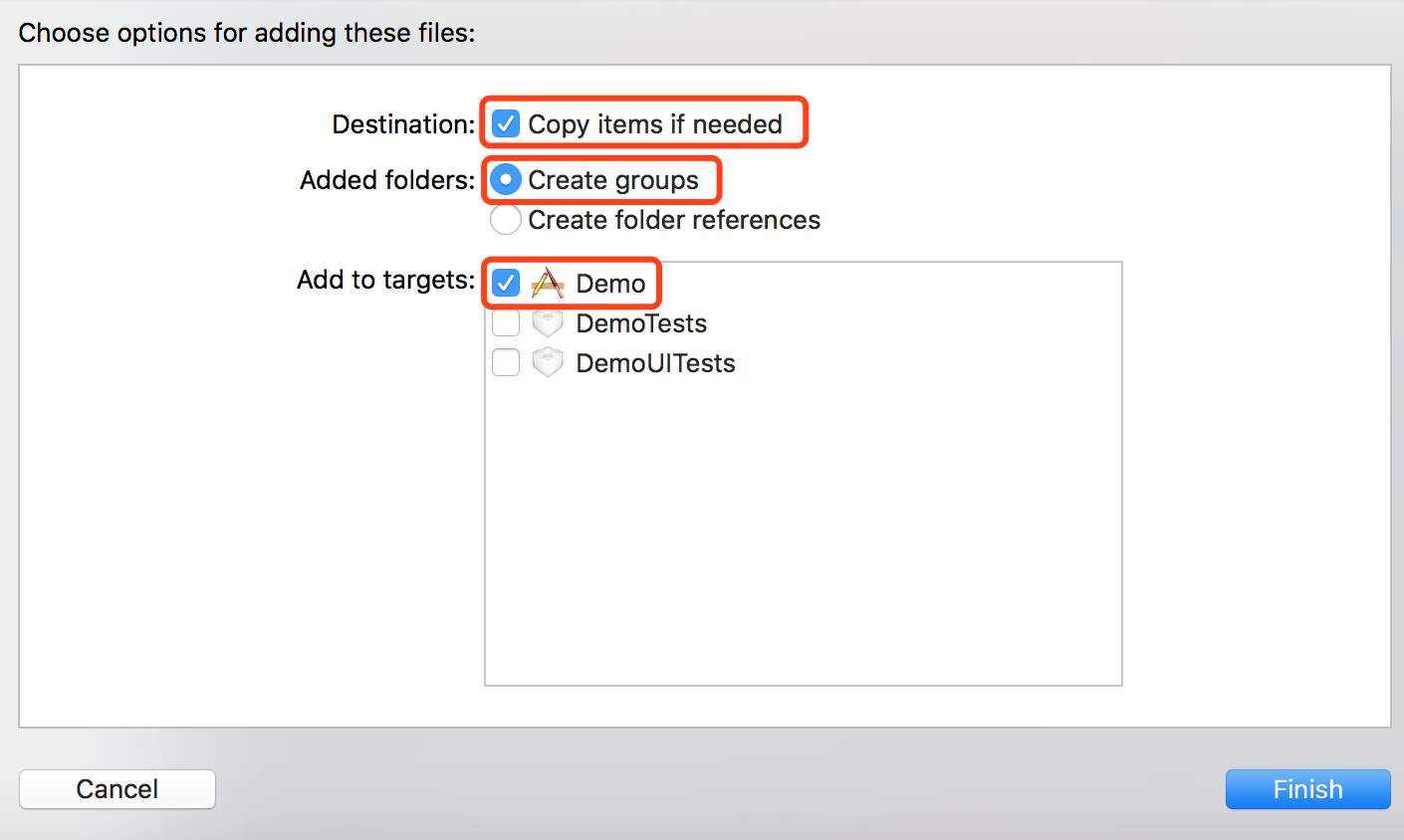 demo 中的 SDK 文件夹为 Hyphenate SDK,将 SDK 文件夹拖入到工程中,并勾选截图中标注的三项。